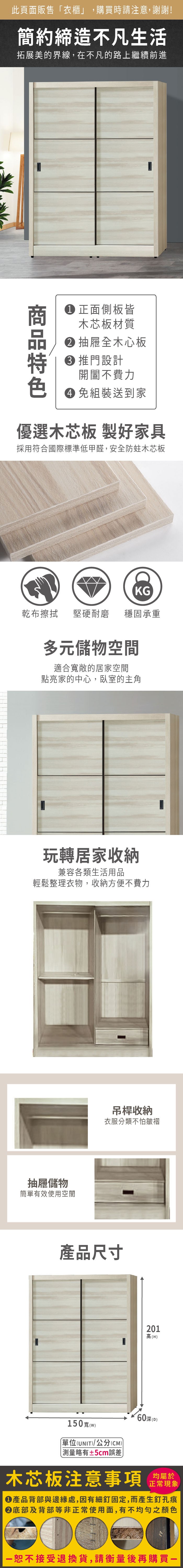文創集 羅麗 橡木紋5尺推門衣櫃-150.5x61.2x196cm免組