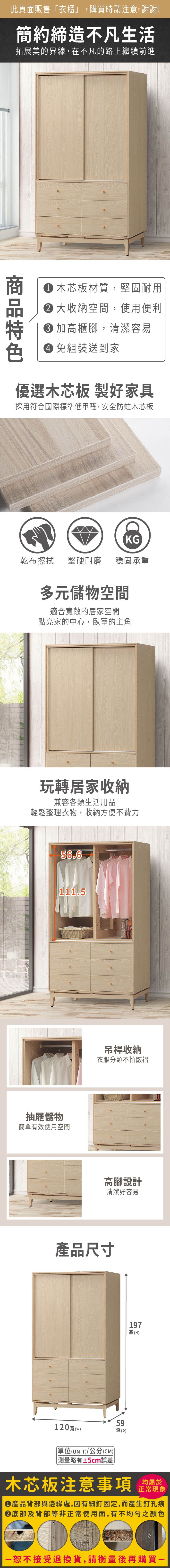 文創集 卡西斯 淺橡4尺推門四抽高衣櫃-120x60x209cm免組