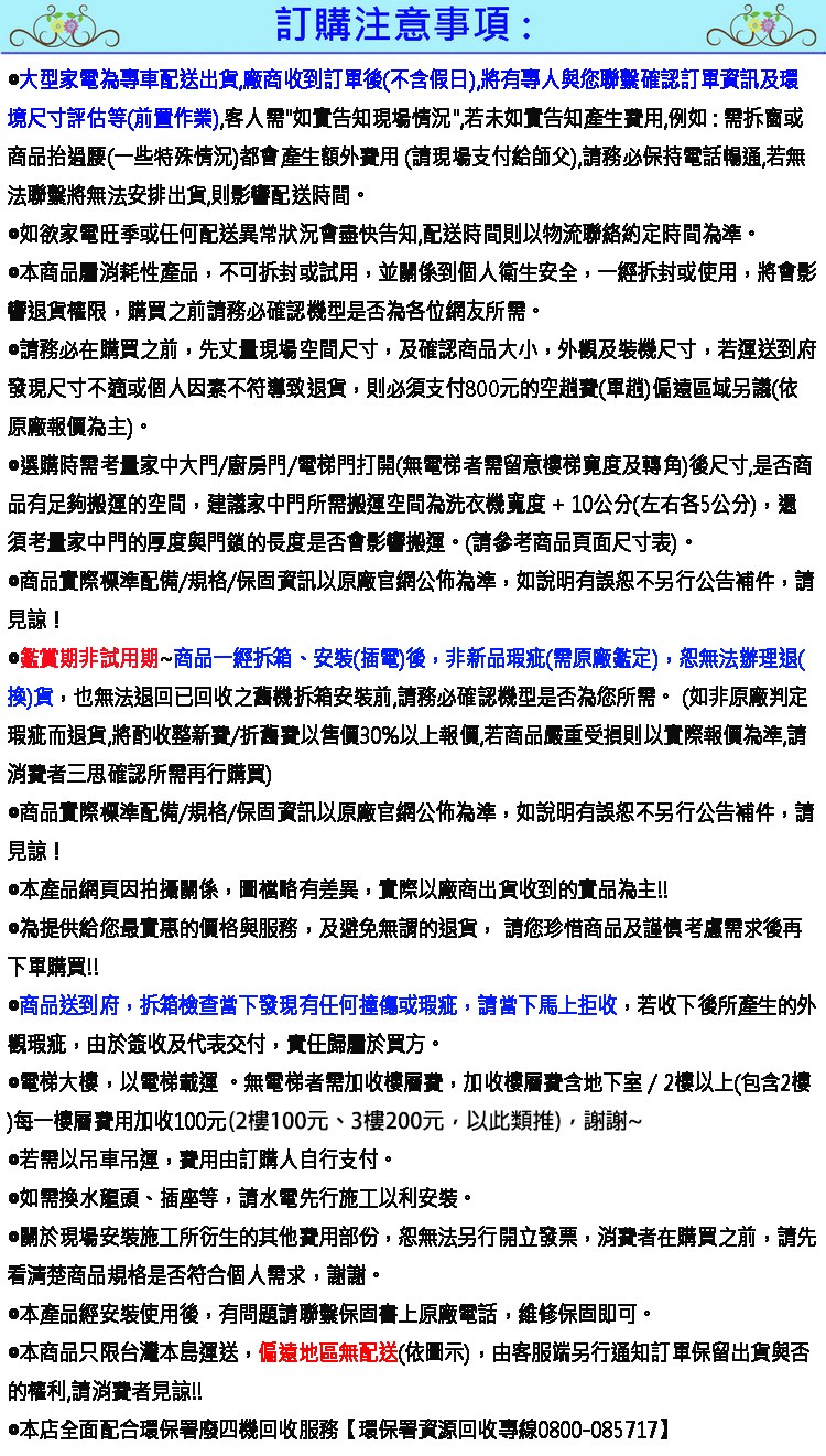 ◎請務必在購買之前,先丈量現場空間尺寸,及確認商品大小,外觀及裝機尺寸,若運送到府發現尺寸不適或個人因素不符導致退貨,則必須支付800元的空趟費(單趟)偏遠區域另議(依原廠報價為主)。
