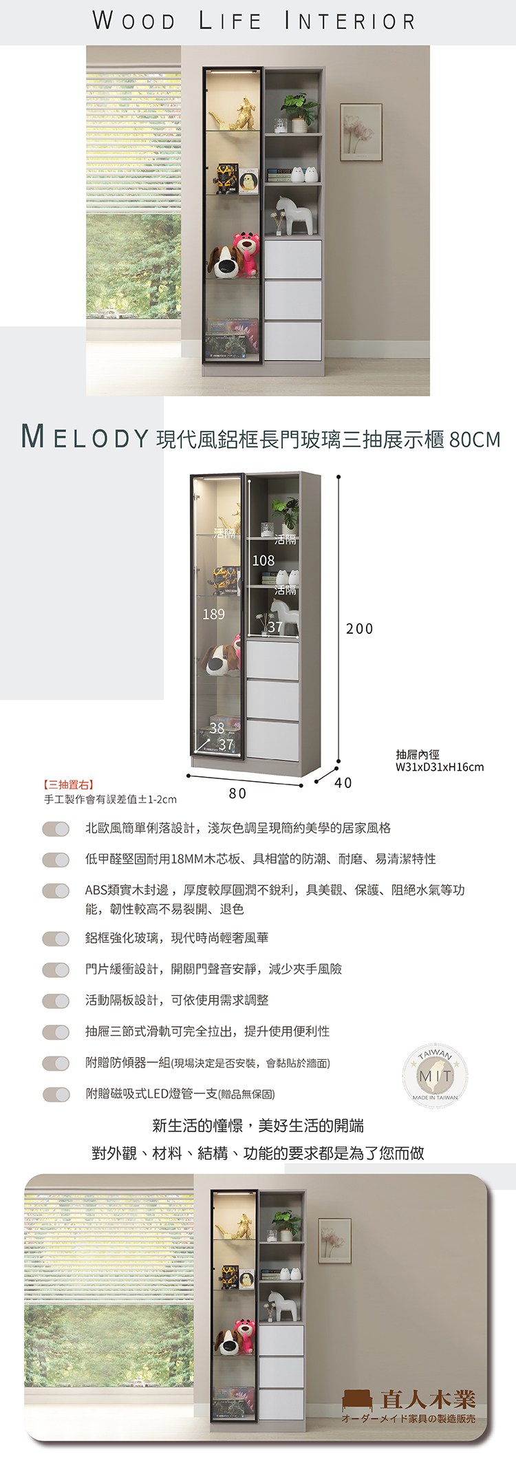 直人木業-MELODY現代風鋁框長門玻璃三抽展示櫃80公分(三抽置右)