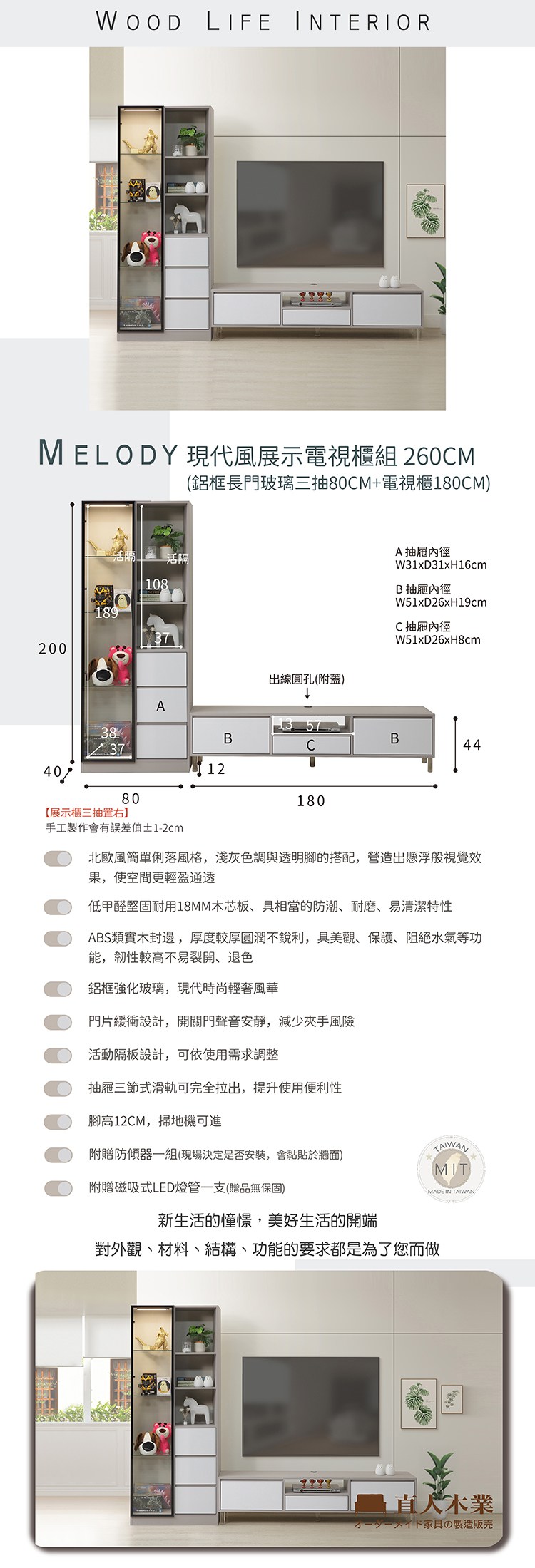 直人木業-MELODY現代風展示電視櫃組260公分(鋁框長門80公分+電視櫃180公分)(三抽置右)