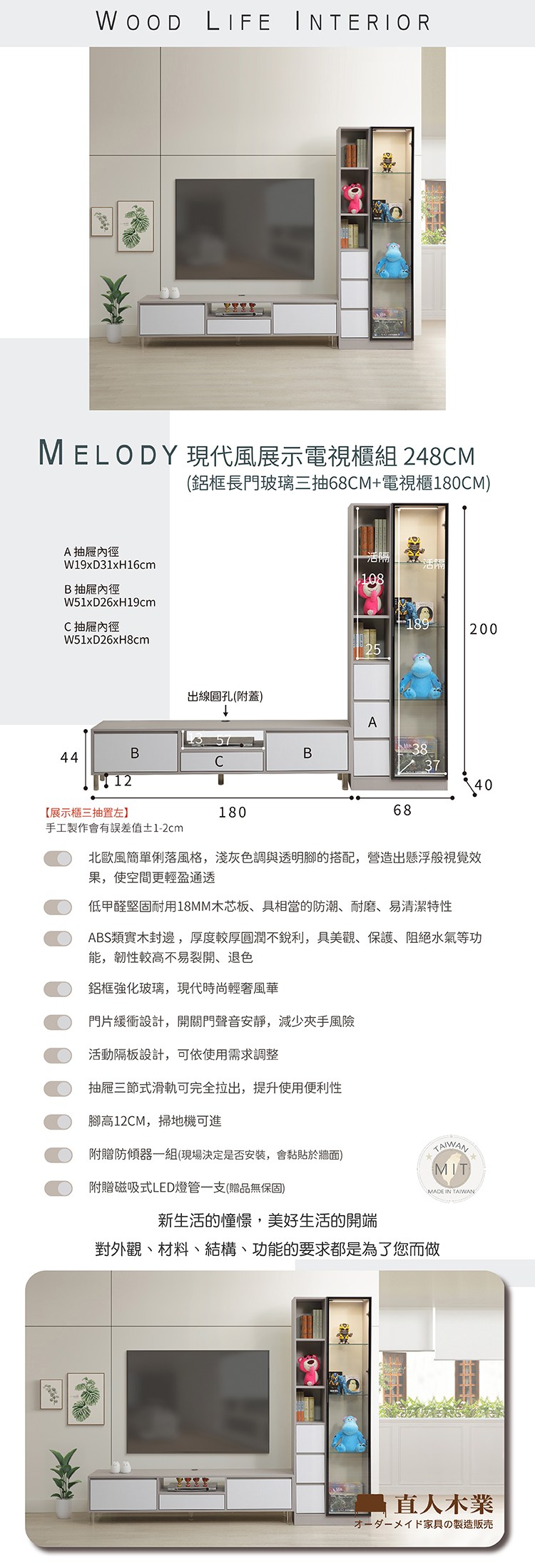 直人木業-MELODY現代風展示電視櫃組248公分(鋁框長門68公分+電視櫃180公分)(三抽置左)