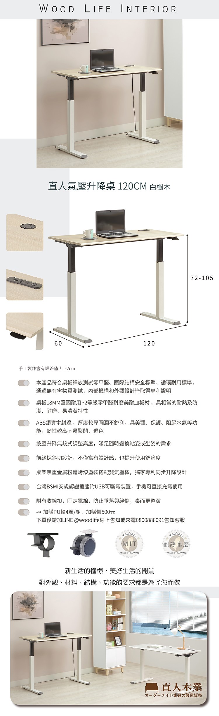 直人木業-直人氣壓升降桌120公分(白楓木)