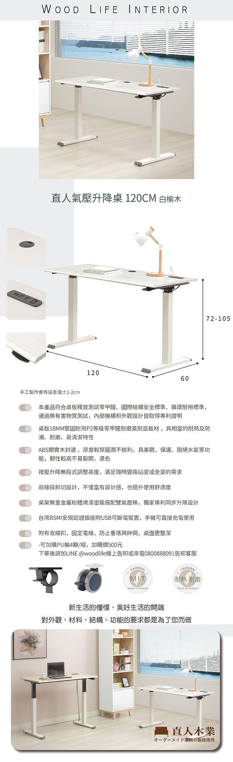 直人木業-直人氣壓升降桌120公分(白榆木)