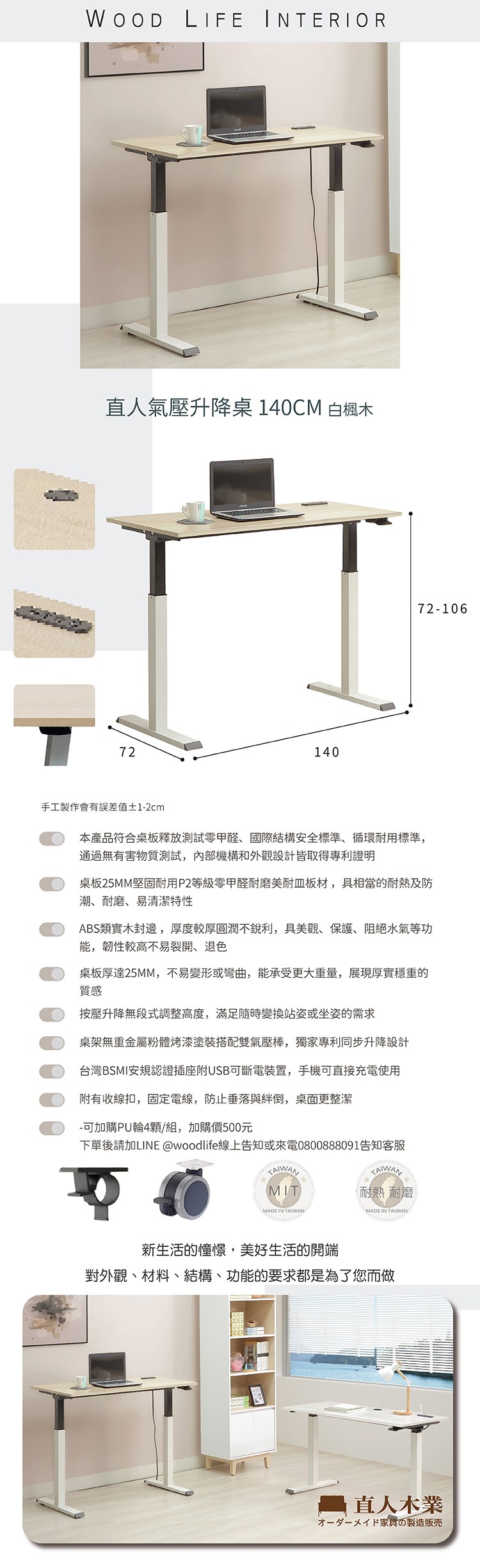 直人木業-直人氣壓升降桌120公分(白楓木)