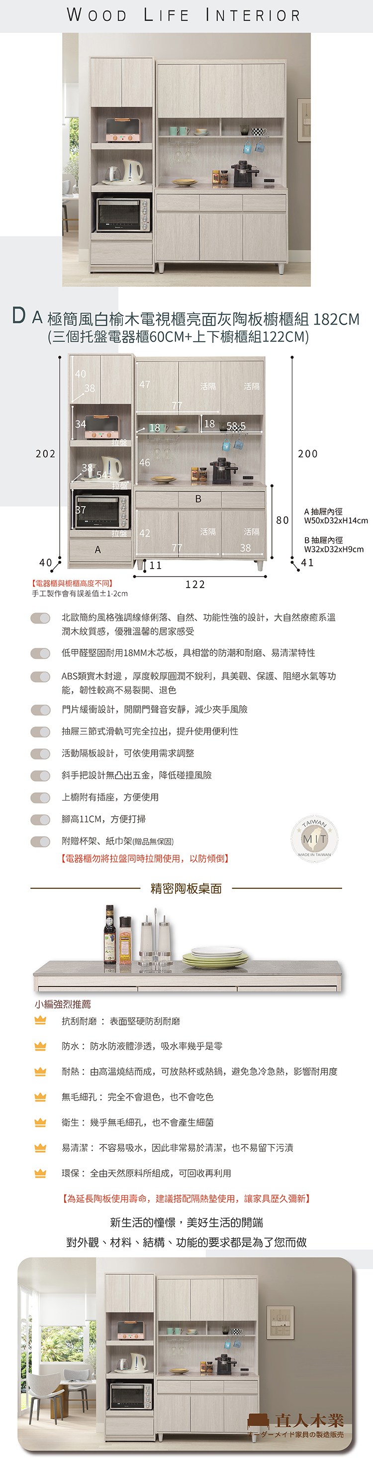 直人木業-DA奶油白榆木亮面陶板拉盤上下櫥櫃組122公分
