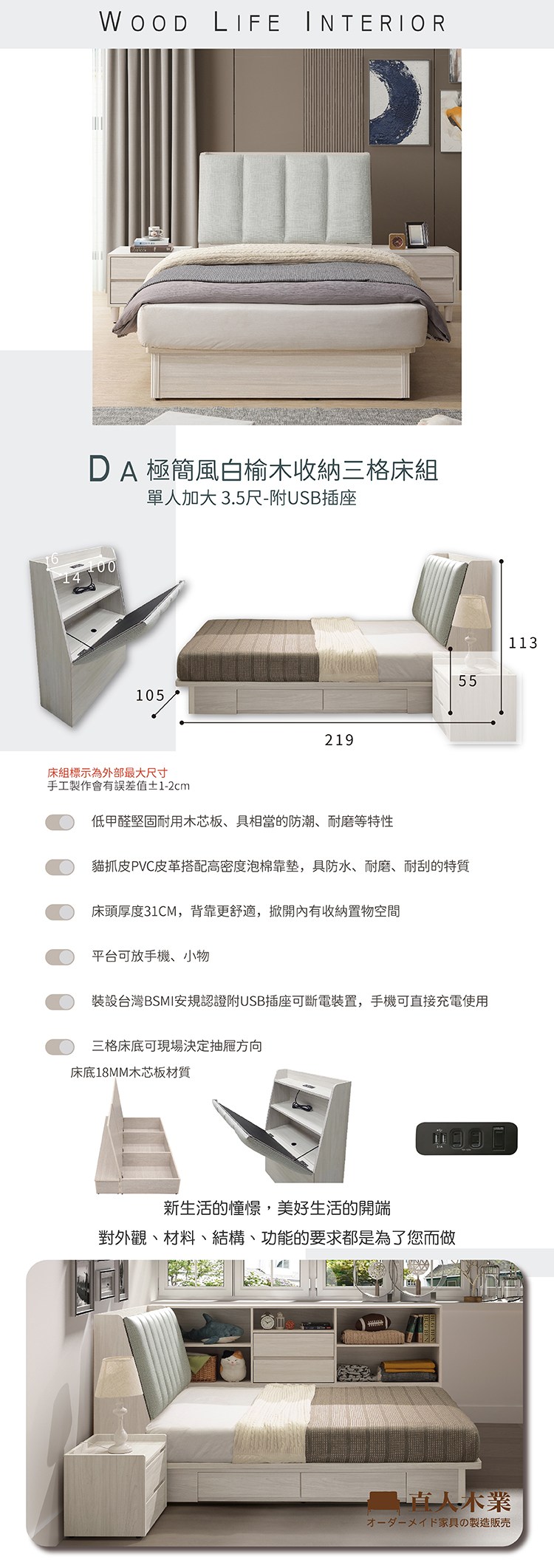 直人木業-DA極簡風白榆木收納三格床組-單人加大3.5尺