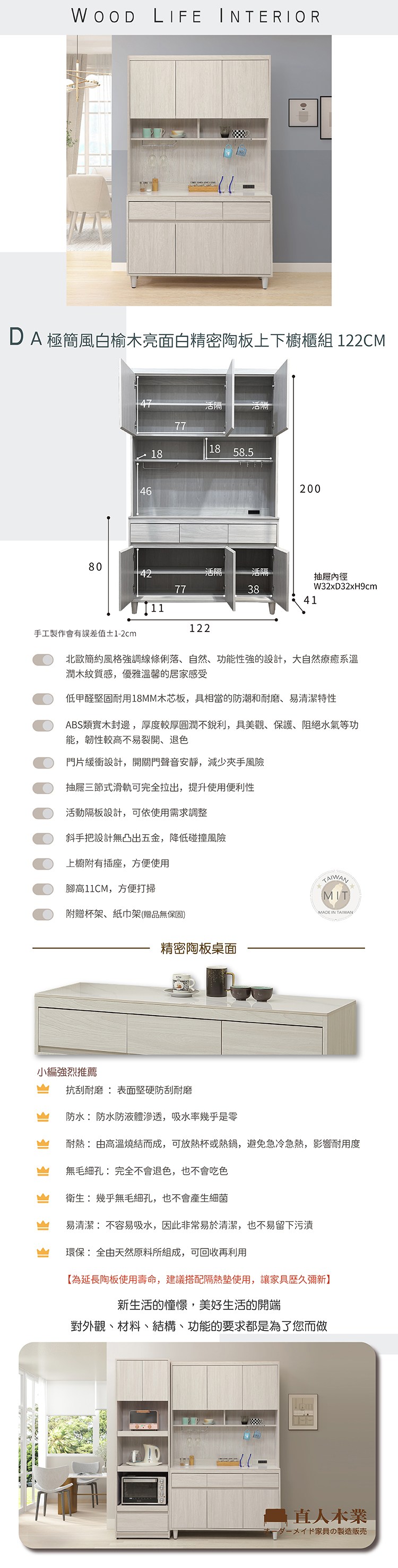 直人木業-DA奶油白榆木亮面陶板拉盤上下櫥櫃組122公分