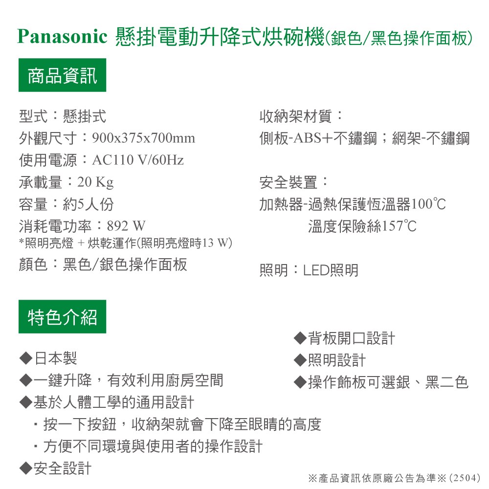 Panasonic國際牌 懸掛電動升降式烘碗機 JUGOU090ZD7W.JUG1U090ZF7W【西部配送】黑色