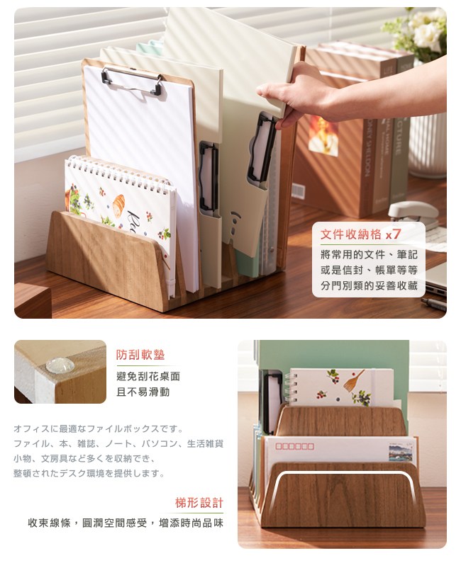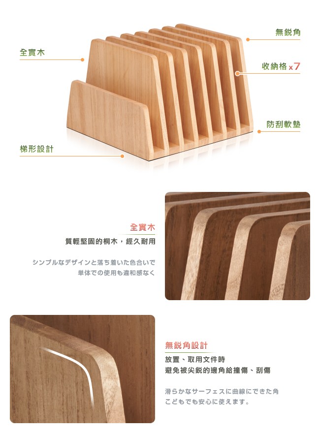 為生活的幸福感而設計,愛上收納就從現在開始。環保植物染不用化學物質,以天然植物油與蠟為基料,滲透進桐木內形成保護層,增添天然木的質感。在桌上專注工作、作業時,取用各種資料,不用再擺滿整個桌面。一個簡約的實木文件夾,將常用的資料夾、文件、筆記,或是信封、帳單等等,分門別類的妥善收藏好。一個收納的小改變,除了讓桌面變得整齊外,做事情也將更有效率。無銳角在放置、取用文件時,不用擔心被尖銳的邊角給撞傷、刮傷。梯形設計收束線條,圓潤空間的感受,增添時尚品味。防刮軟墊避免刮花桌面,且不易滑動。