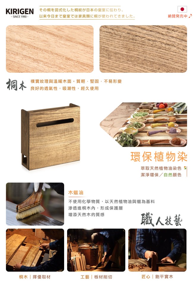 桐木質輕且不透濕氣,少分叉與歪斜,其木質特色特別適合台灣海島型潮濕氣候。特性重量輕、吸潮、透氣性好、不易變形、結構穩定性強、顏色好看。木材紋理通直,刨光後有絹絲光澤。桐木有很好的象徵意義,象徵富貴,被認為是高級木材之瑰寶。自古以來,是日本皇室御用的傢俱,尊貴不凡,而今依舊如此。