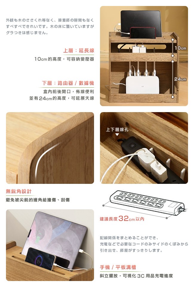 雙層設計,上層可放入延長線,下層收納分享器、數據機、電視盒等等。上下層相通的線孔,方便下層設備的電線,插入上層的延長線。天板手機溝槽,手機擺放、取用方便,即使雙手機或平板充電,依然井然有序。掀蓋式天板&圓矩把手,開闔順暢自如,輕鬆插拔電源插座。電源開關孔,專為省電式延長線&獨立開關設計,無須掀蓋,即可掌控電源。無銳角造型,圓角安全防撞傷、刮傷。收納盒背面鏤空,方便插拔各式變壓器;上下層實木擋板,固定延長線與設備,防止滑落移出。踢腳板槽,緊密貼合牆壁,避免產生間隙。防刮絨毛墊,保護地板&桌面,避免刮花。