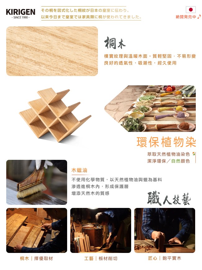 桐木質輕且不透濕氣,少分叉與歪斜,其木質特色特別適合台灣海島型潮濕氣候。特性重量輕、吸潮、透氣性好、不易變形、結構穩定性強、顏色好看。木材紋理通直,刨光後有絹絲光澤。桐木有很好的象徵意義,象徵富貴,被認為是高級木材之瑰寶。自古以來,是日本皇室御用的傢俱,尊貴不凡,而今依舊如此。