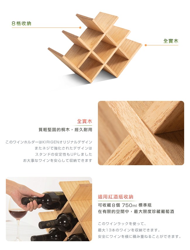 為生活的幸福感而設計,愛上收納就從現在開始。環保植物染不用化學物質,以天然植物油與蠟為基料,滲透進桐木內形成保護層,增添天然木的質感。適用紅酒瓶收納,可放 8 個 750ml 標準瓶。在有限的空間中,最大限度珍藏葡萄酒。