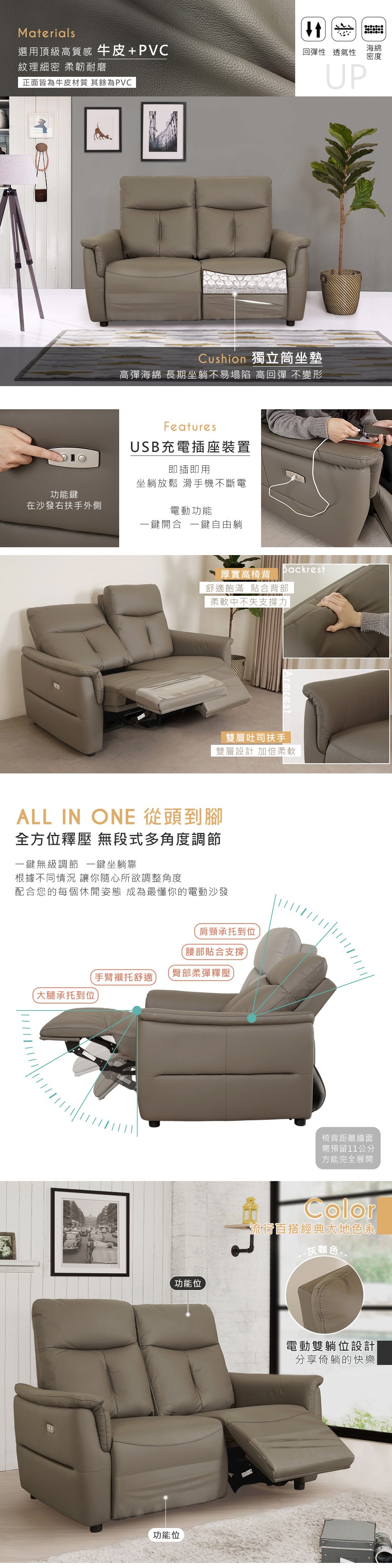 Homelike 喜家居雙人座雙電動沙發(灰咖色)(2367)