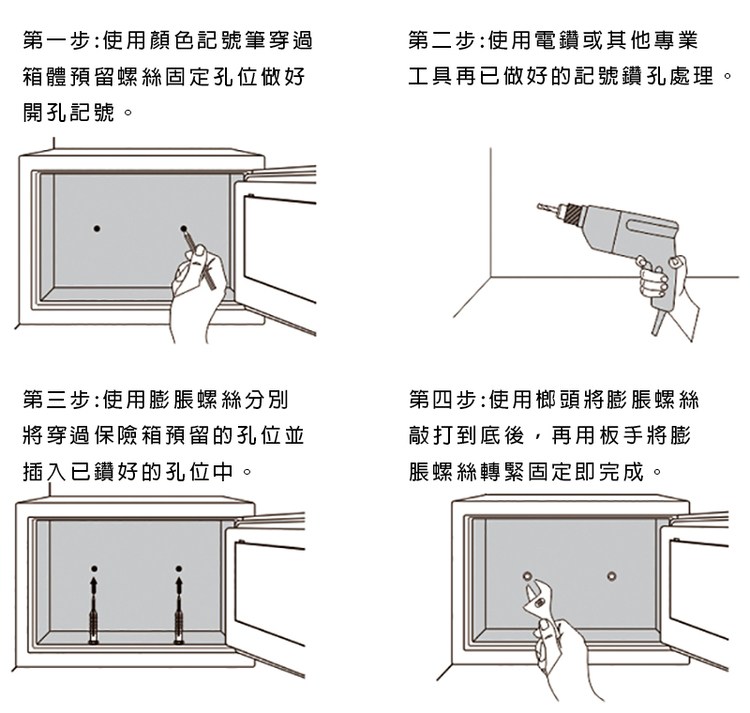 標準配件:保險箱*1、應急鑰匙*2、外接電池盒*1、膨脹螺絲