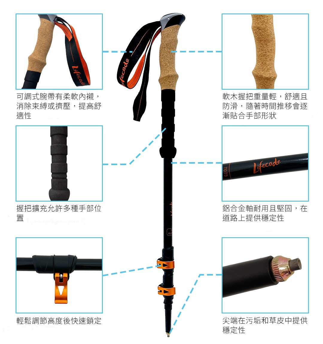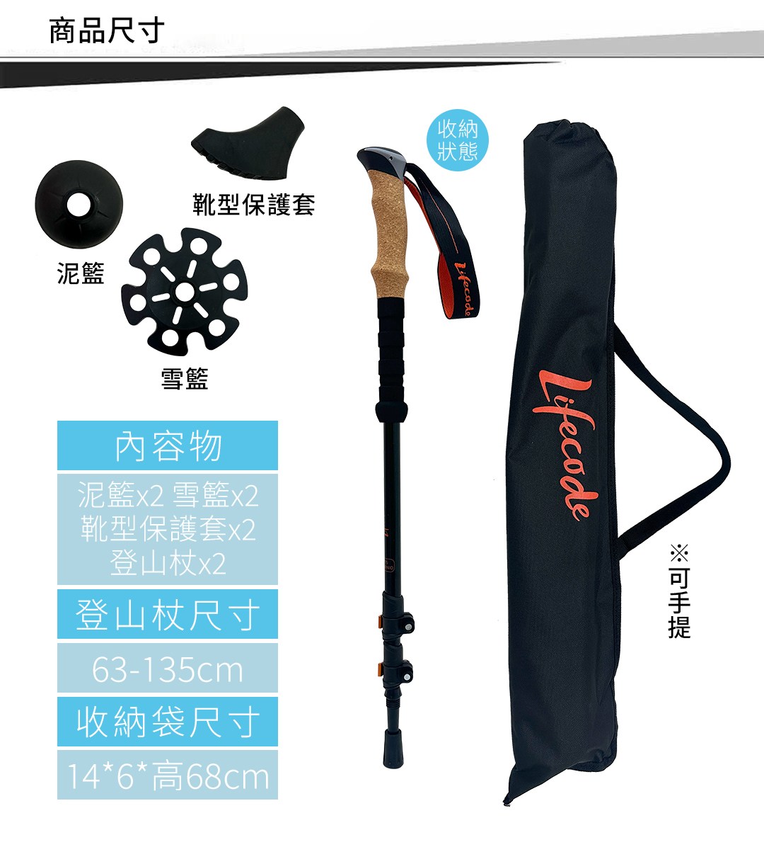 《LIFECODE》 輕量7075鋁合金伸缩健走杖/登山杖-2入提袋裝21000020