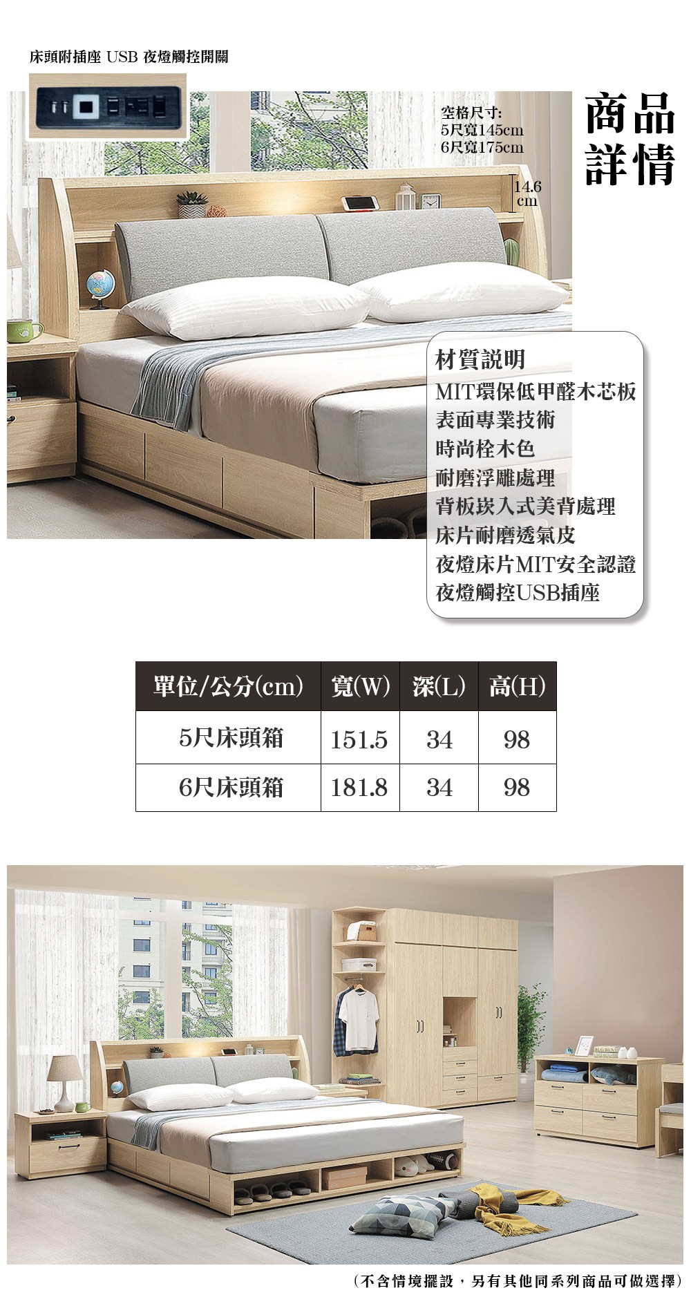 ※此賣場僅販售 亞維莉USB夜燈床頭箱(雙人5尺)※
