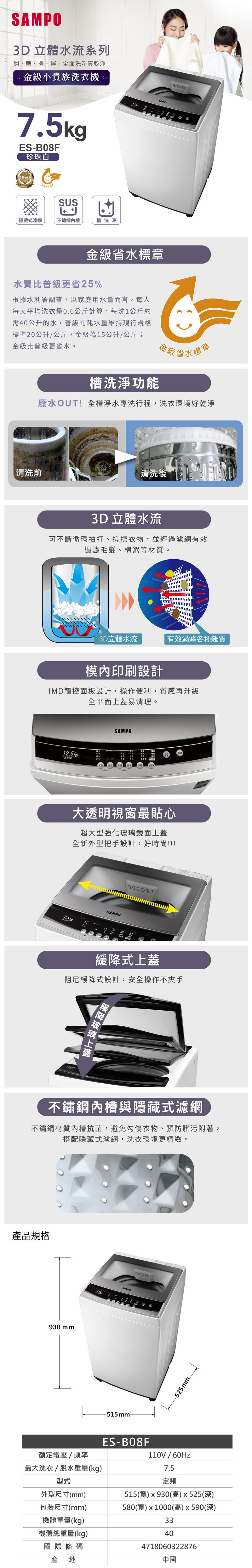 SAMPO聲寶7.5公斤單槽定頻直立式洗衣機 ES-B08F~含基本安裝+舊機回收