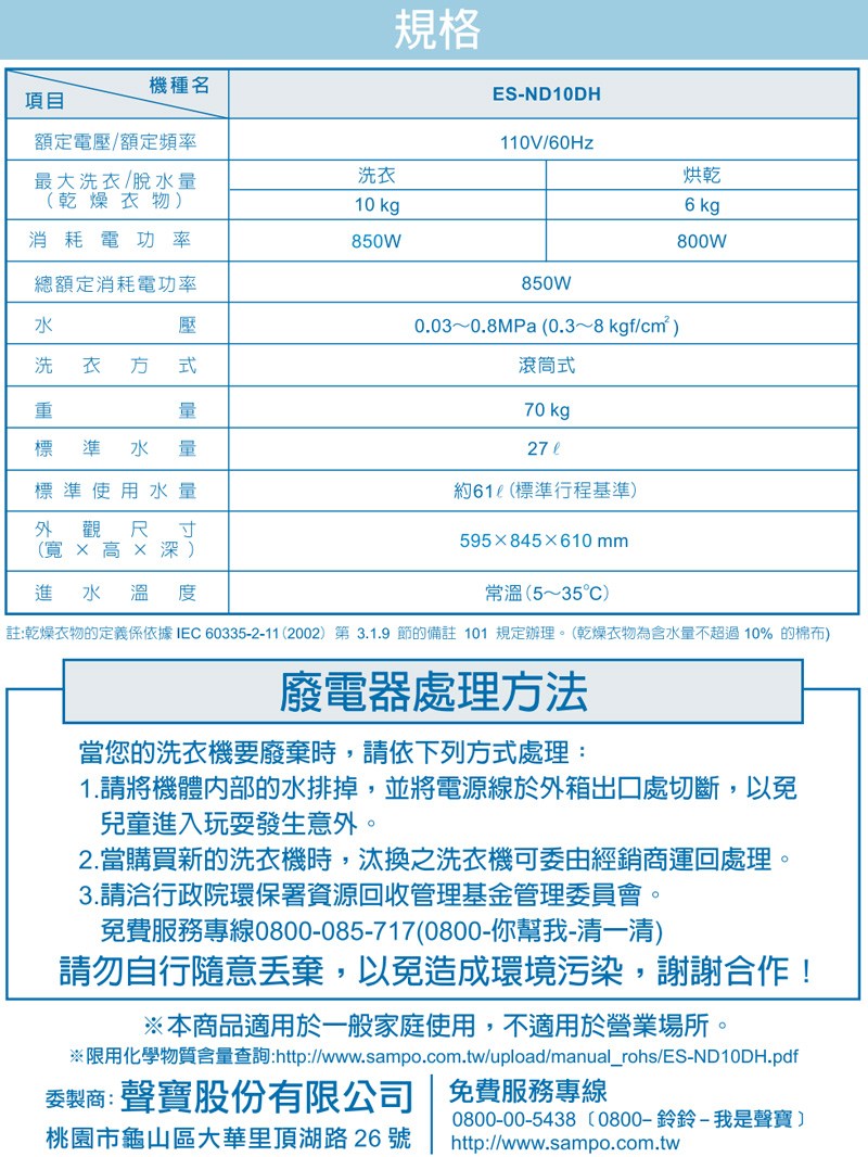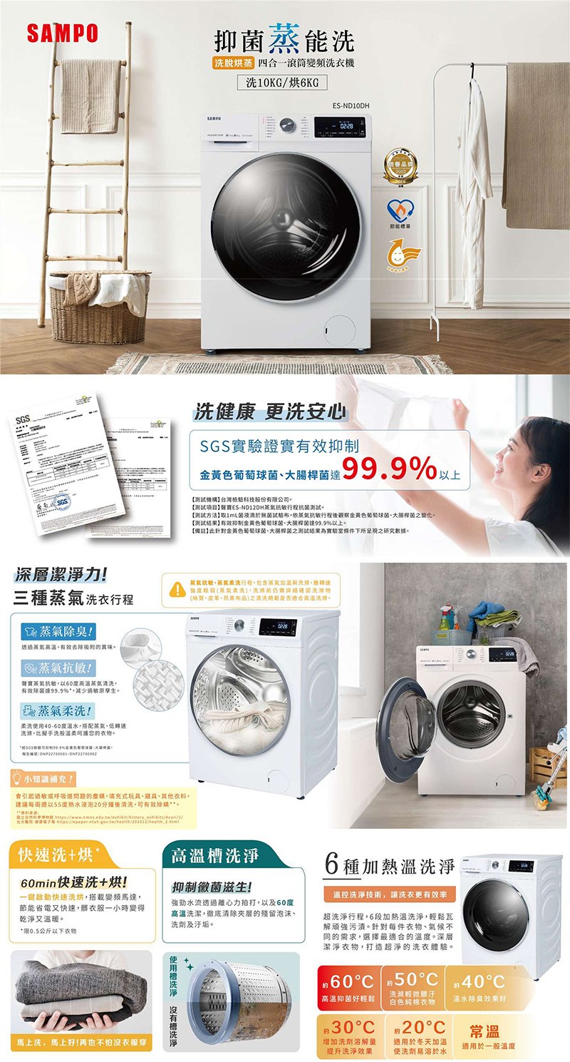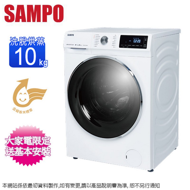 SAMPO聲寶10公斤變頻抑菌蒸能洗滾筒洗衣機 ES-ND10DH~含基本安裝+舊機回收