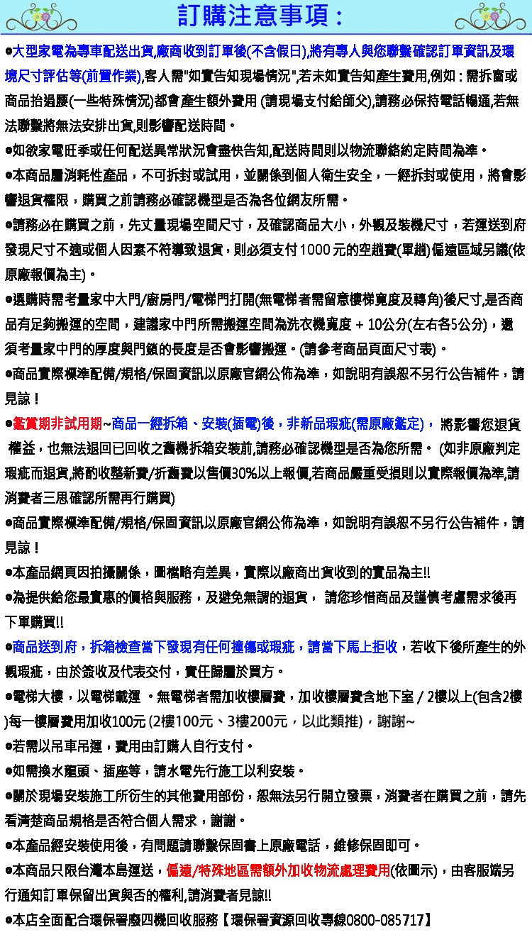 ◎請務必在購買之前,先丈量現場空間尺寸,及確認商品大小,外觀及裝機尺寸,若運送到府發現尺寸不適或個人因素不符導致退貨,則必須支付1000元的空趟費(單趟)偏遠區域另議(依原廠報價為主)。