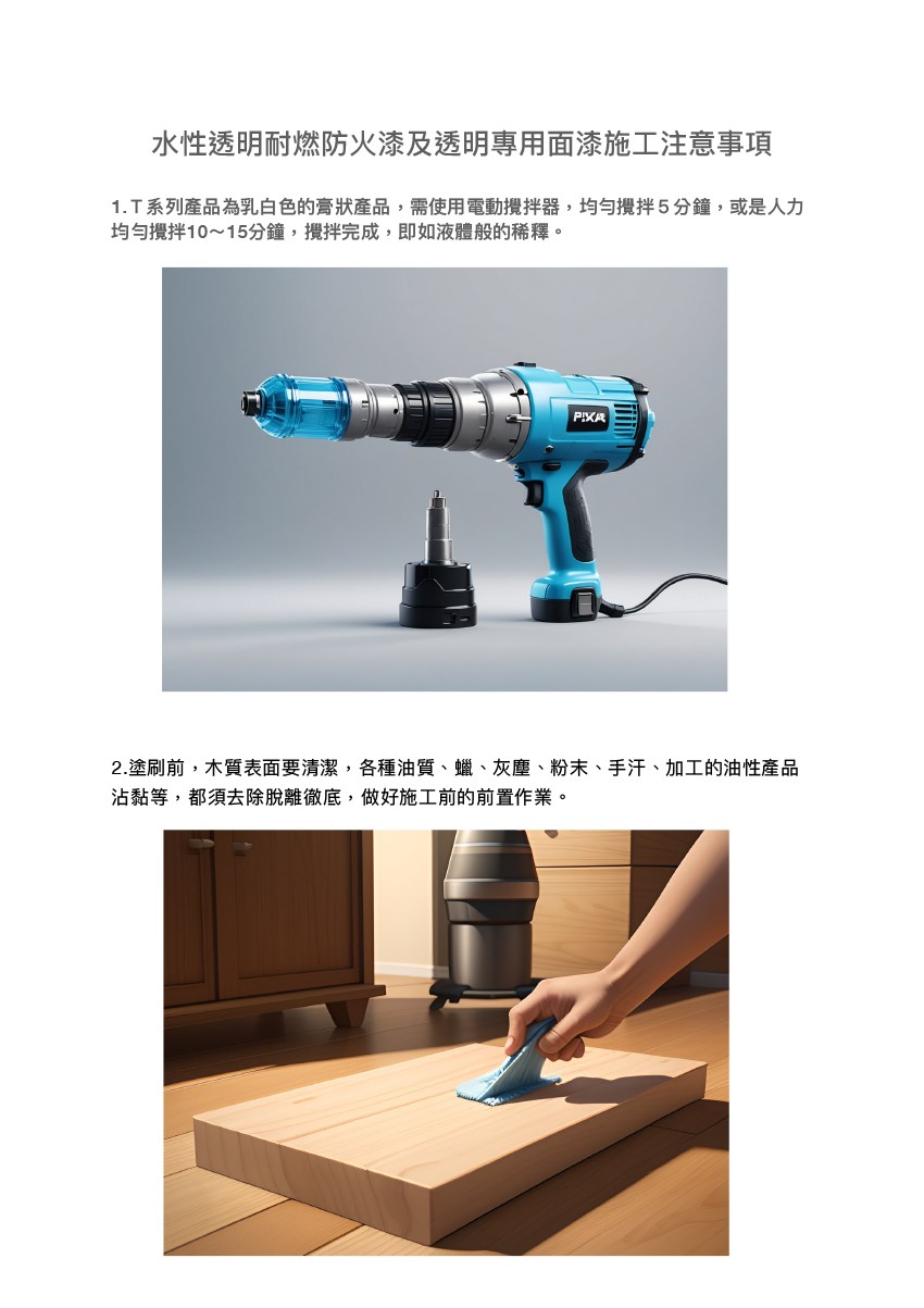 4. 防火漆層塗刷24小時後,即可塗刷TOP-T專用透明面漆,塗刷專用面漆時,請先徹底攪拌,毛刷必須與防火漆分開使用, 請勿加水溶劑,塗刷後約48小時待乾燥,期間請避免觸碰。