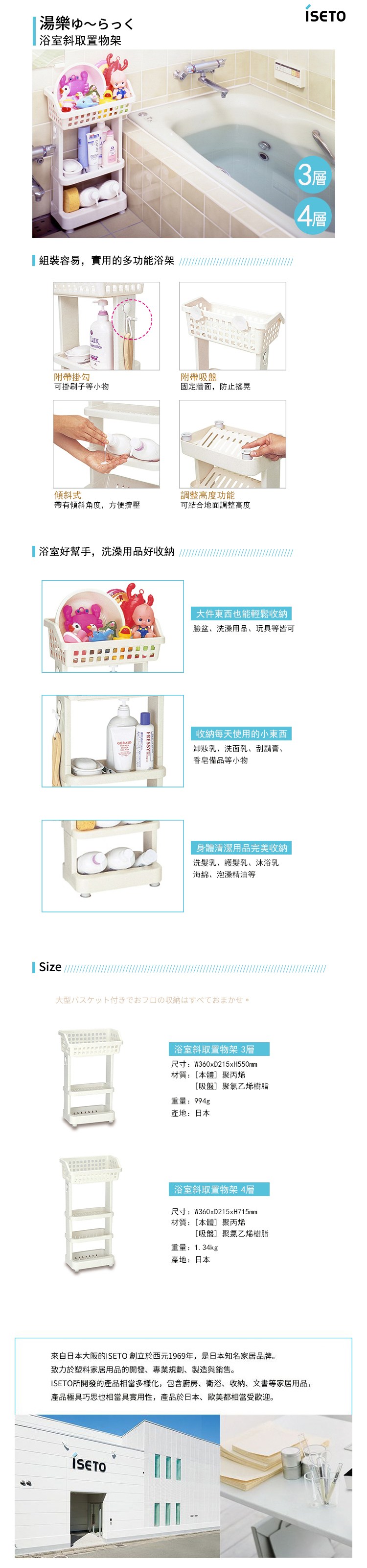 【日本ISETO】日製浴室斜取置物架-4層