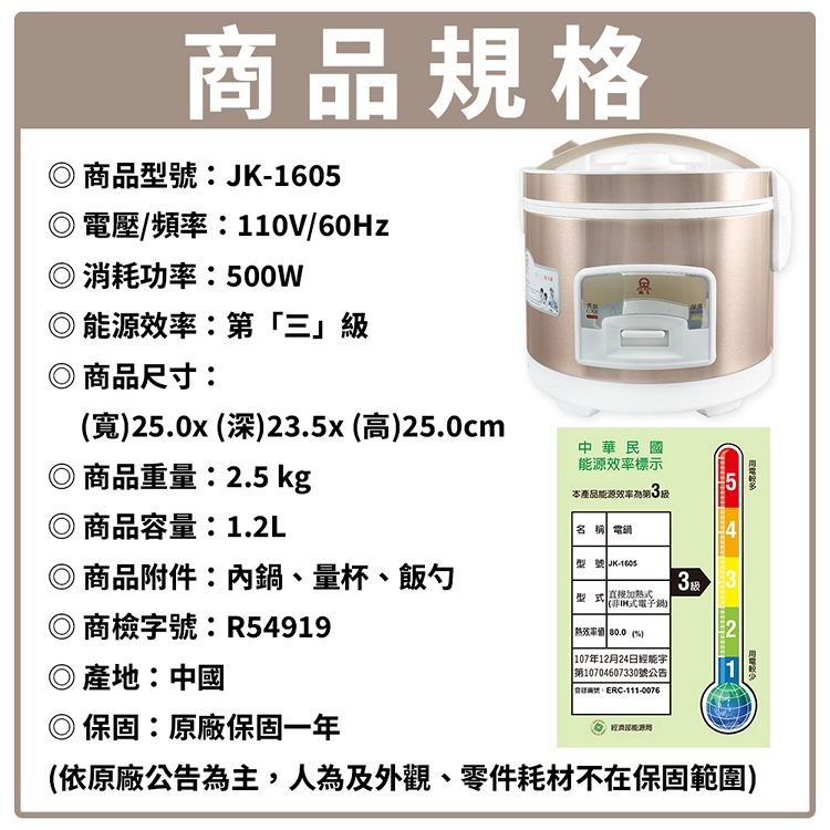 【Jinkon晶工牌】六人份電子鍋 JK-1605