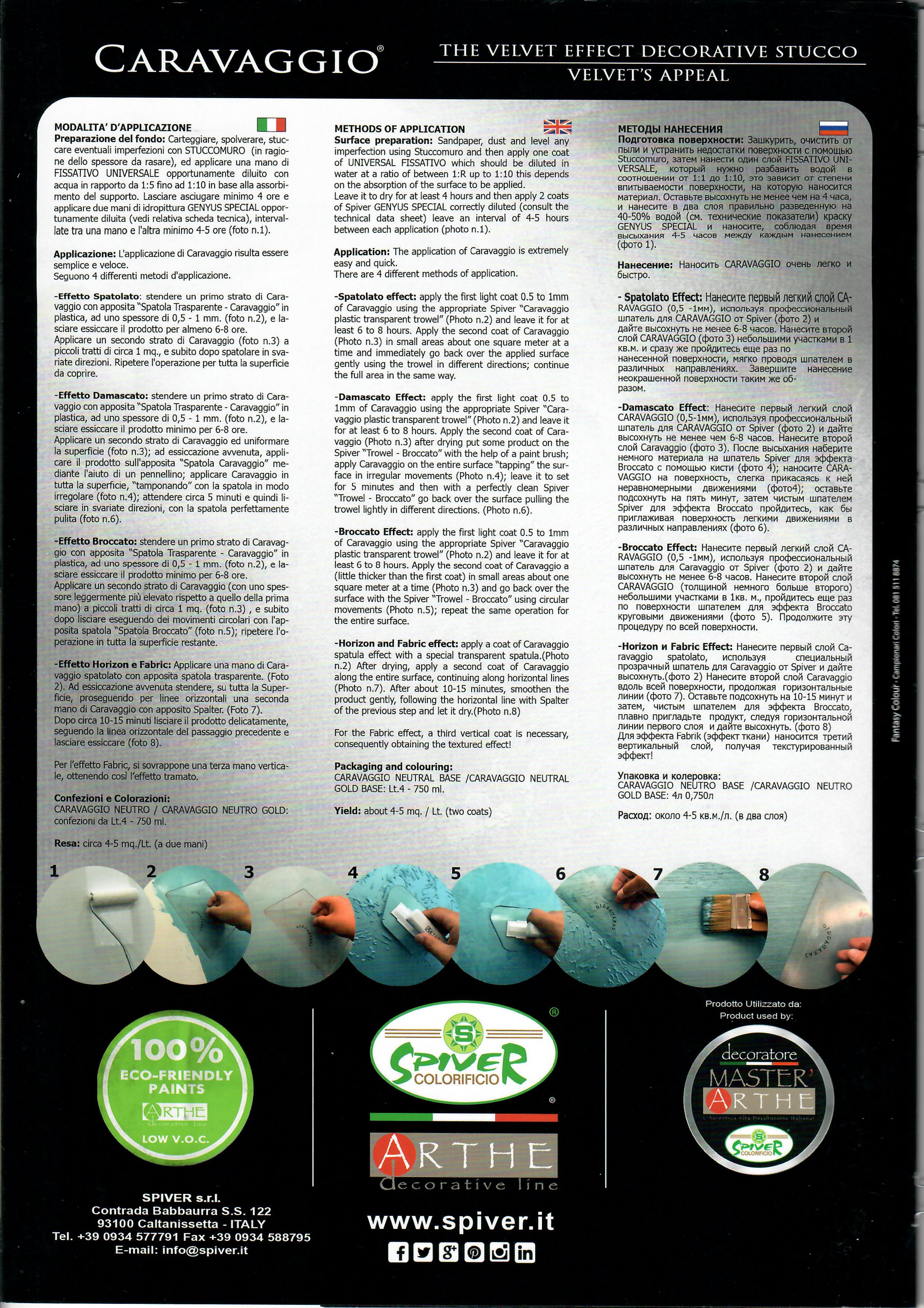 Spiver Caravaggio 系列主打高質感的藝術塗料,包括金屬質感、絲絨效果、大理石紋理、仿舊做舊風等,廣泛應用於住宅、商業空間、飯店及高級展場等場合。每一款產品都強調獨特的視覺層次與手工質感,能根據設計師或使用者的創意進行個性化定制。