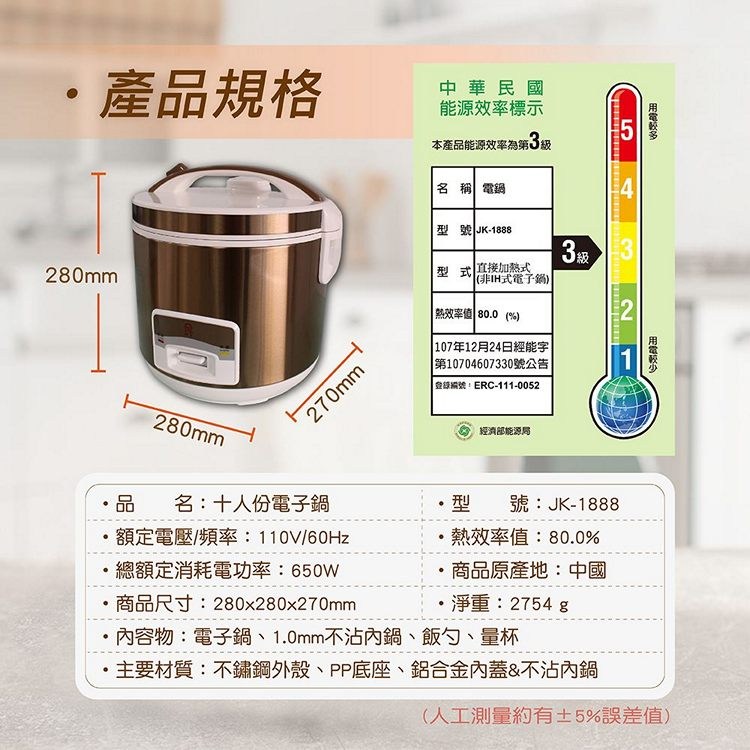 【Jinkon晶工牌】十人份電子鍋 JK-1888