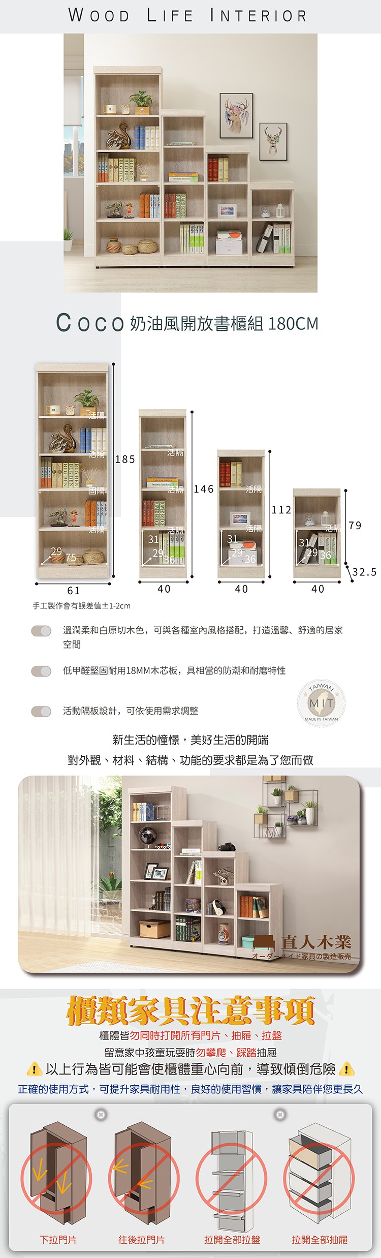直人木業-COCO奶油風開放書櫃組180公分