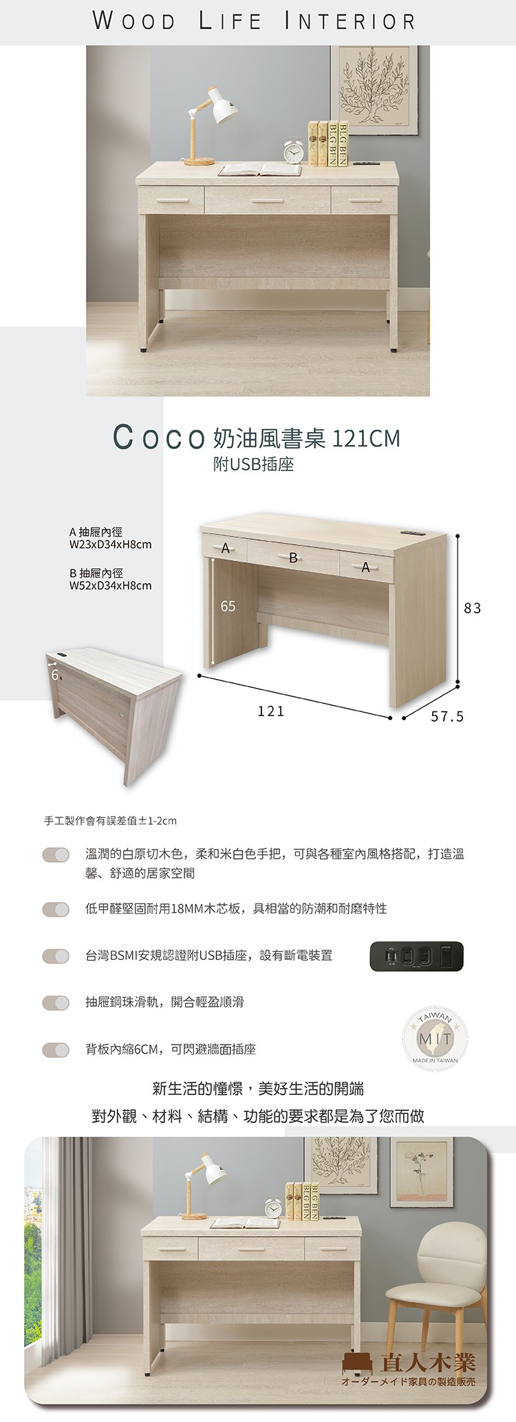 直人木業-COCO奶油風書桌附USB插座121公分