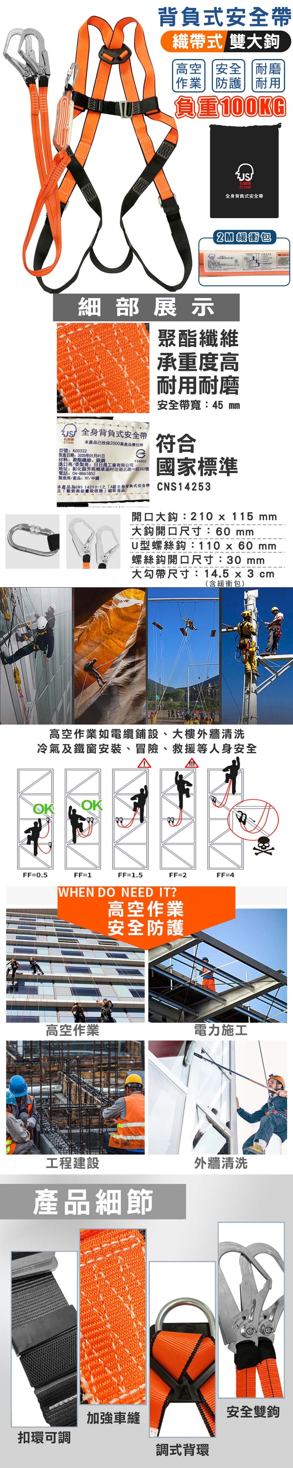 石頭牌 雙織帶 雙大鉤背負式安全帶(含緩衝包)
