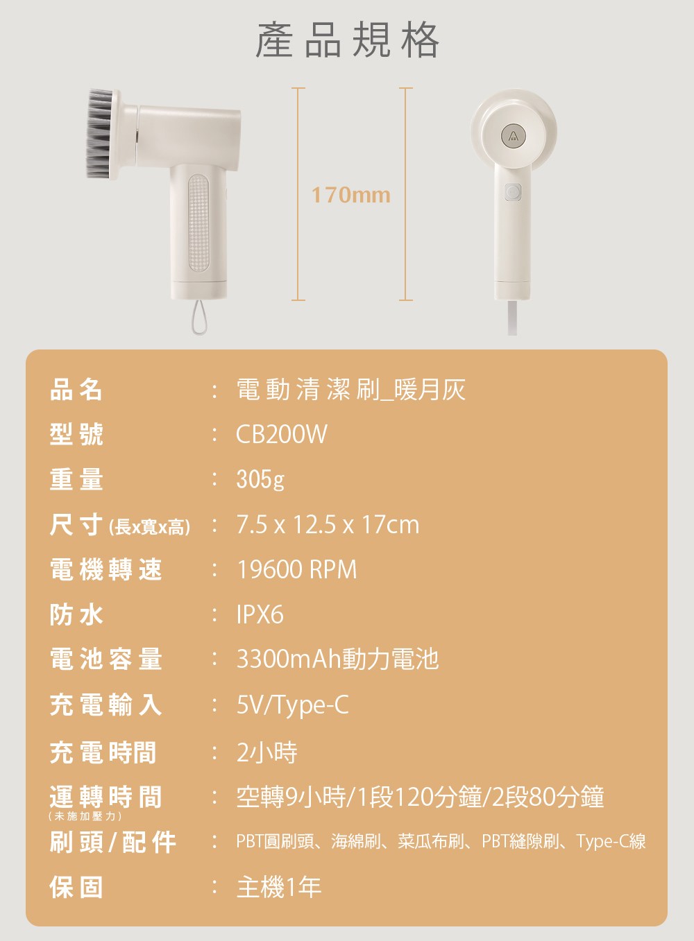ARTISAN USB充電式電動清潔刷 暖月灰 CB200W 原廠