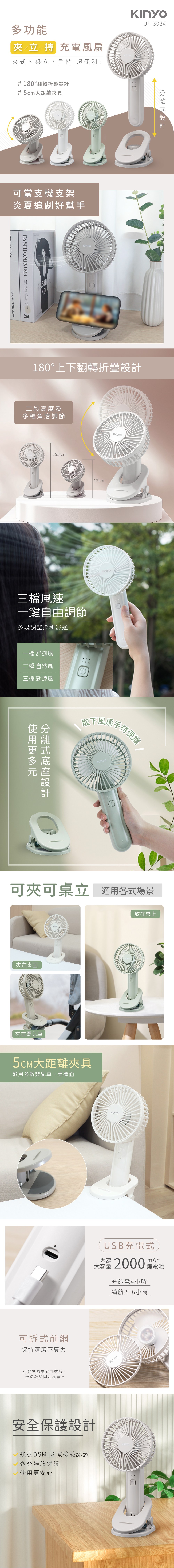 Kinyo 夾立持充電風扇 白 UF-3024W