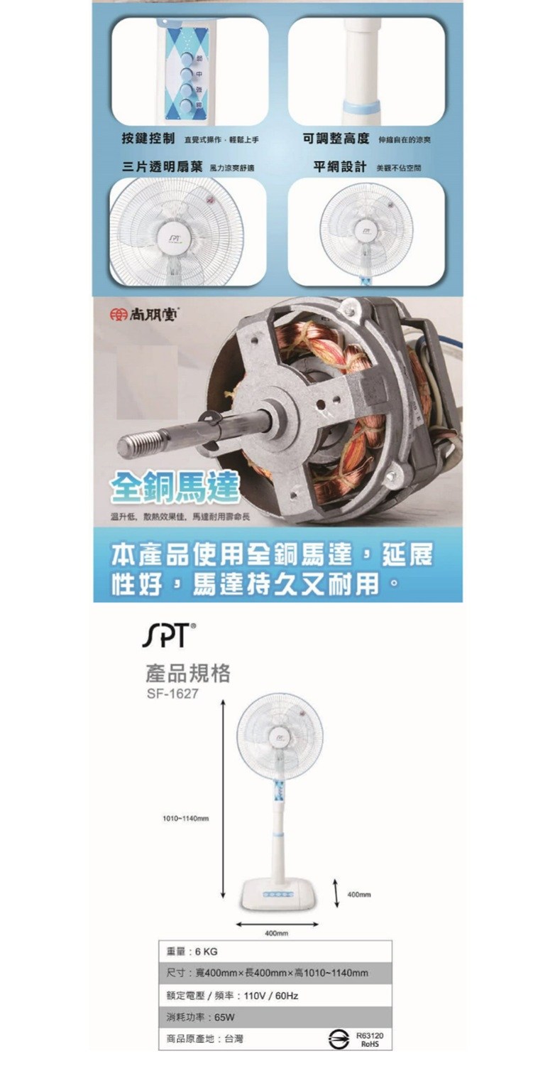 尚朋堂 18吋45cm立地電風扇 SF-1918P 全銅馬達 3段風速 45度擺頭 可調整高度20cm