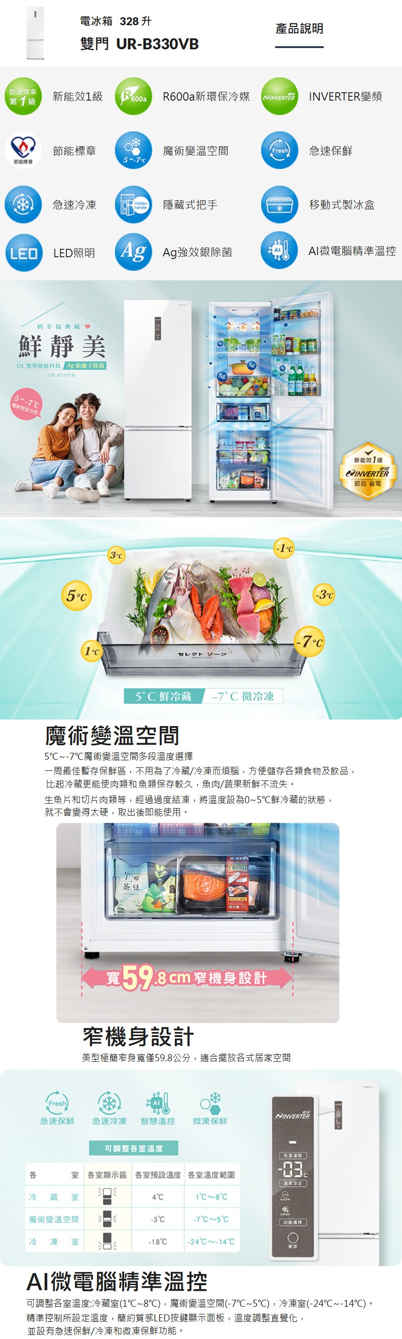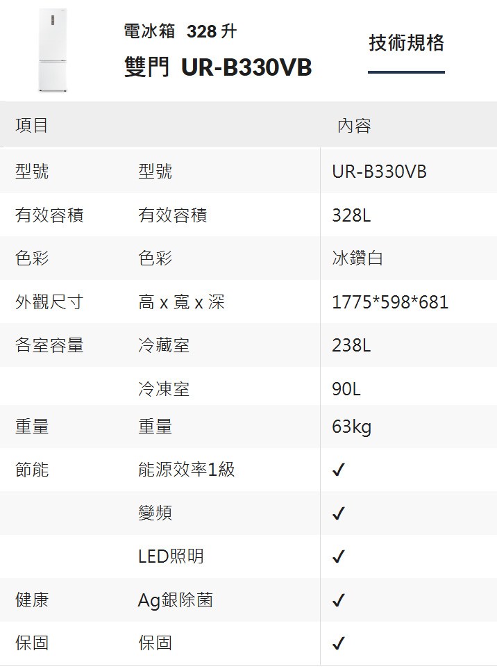 CHIMEI奇美328公升一級能效變頻雙門電冰箱 UR-B330VB~含拆箱定位+舊機回收