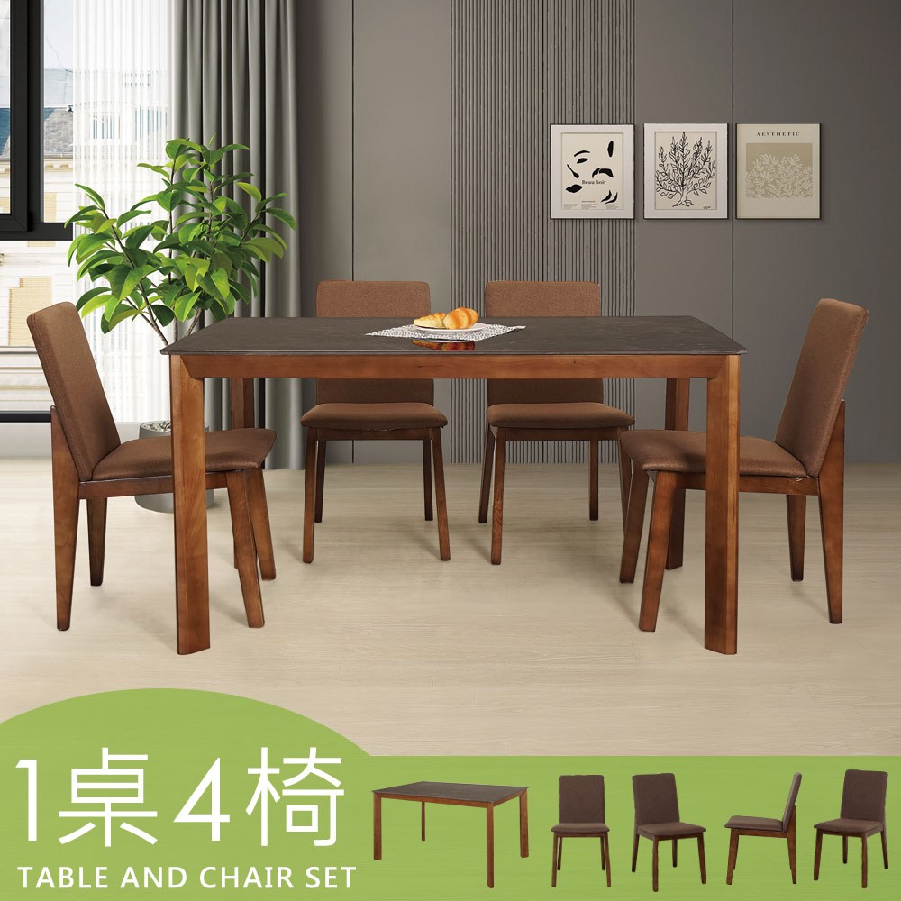 Homelike 喜家居140cm黑岩板胡桃餐桌椅組(一桌四椅)(2316-31)