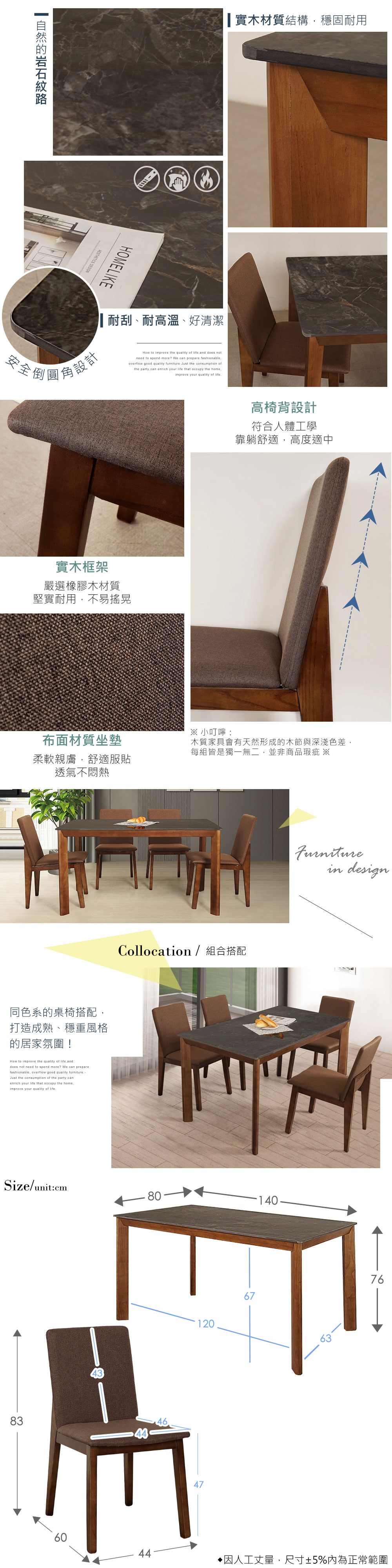 Homelike 喜家居140cm黑岩板胡桃餐桌椅組(一桌四椅)(2316-66)