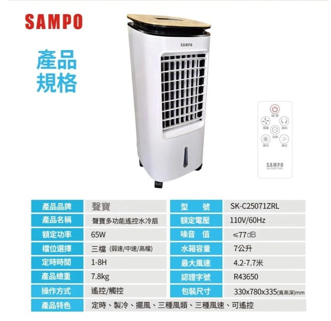 SAMPO 聲寶 多功能遙控水冷扇 7L SK-C25071ZRL