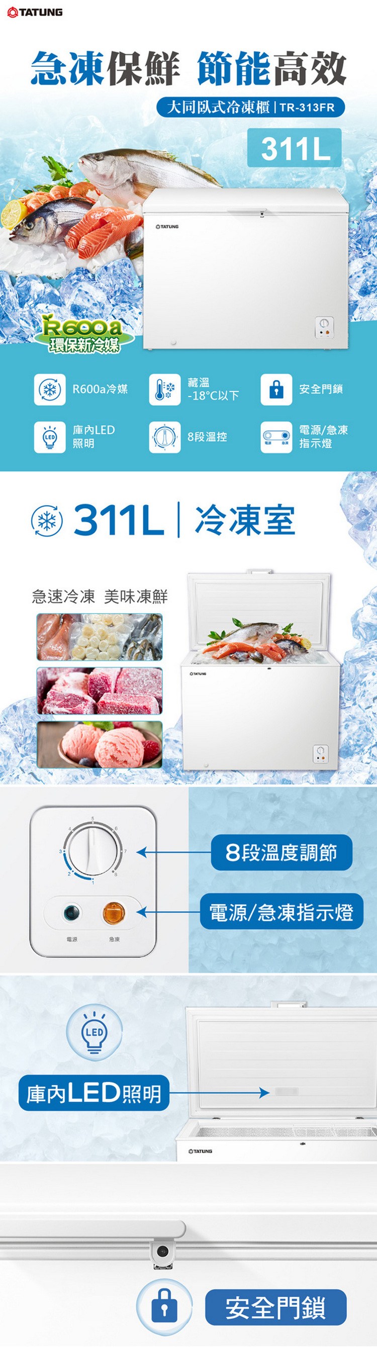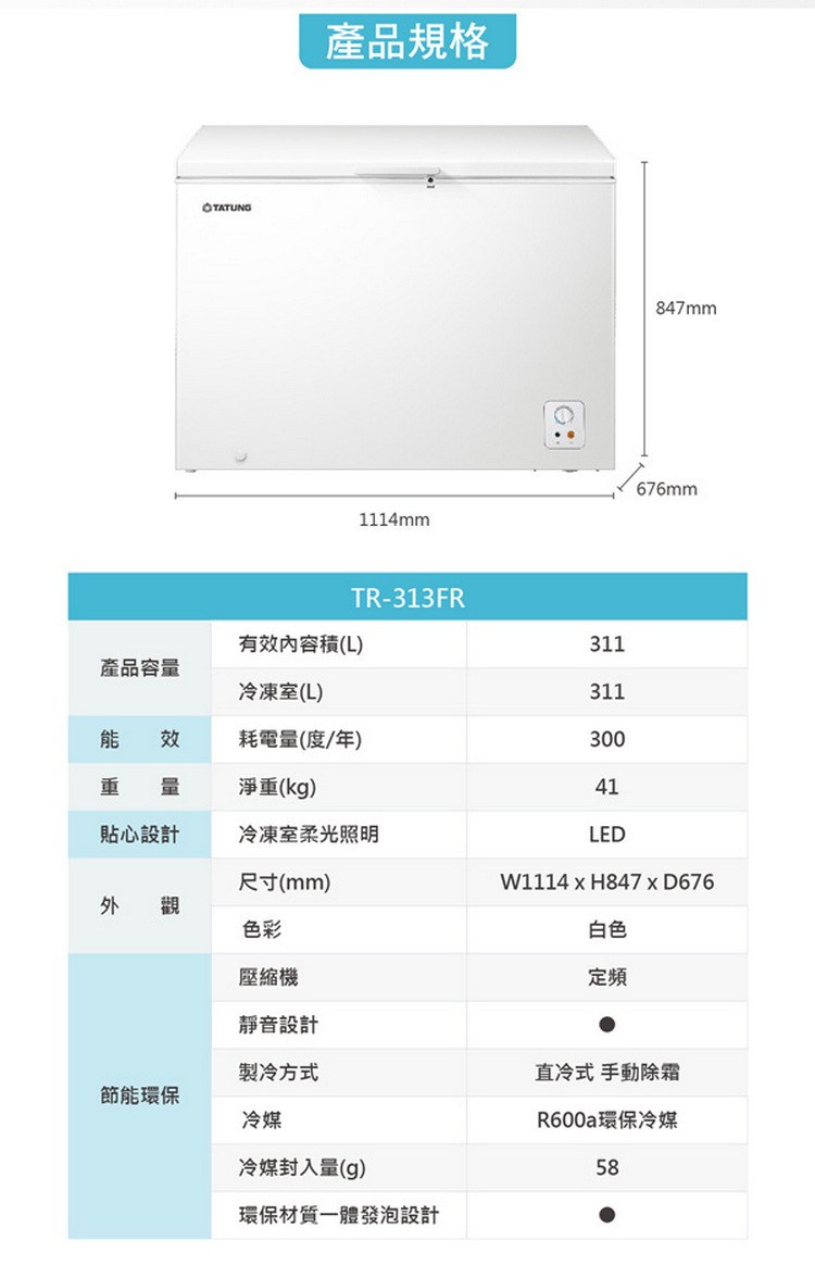 TATUNG大同311公升定頻臥式冷凍櫃 TR-313FR~含拆箱定位+舊機回收