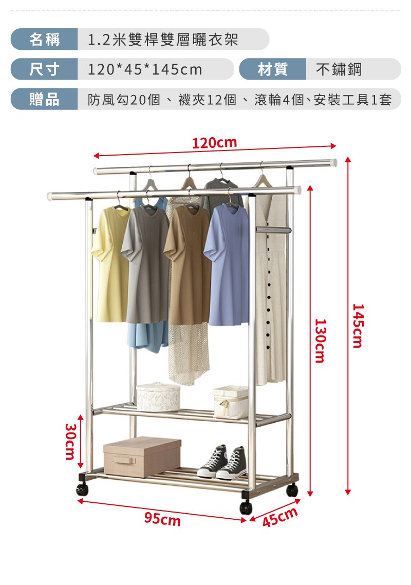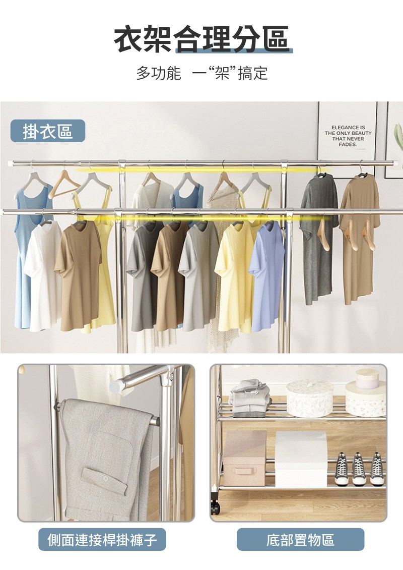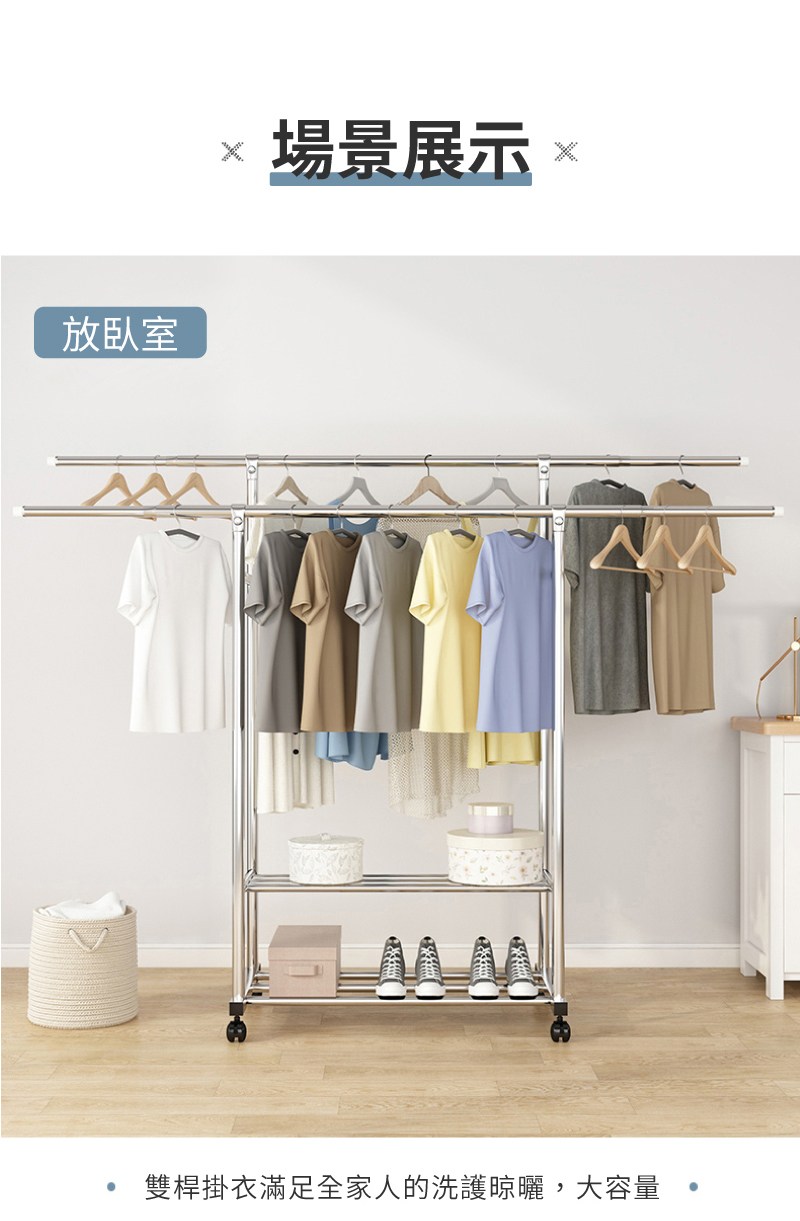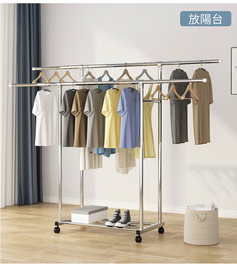 【居家cheaper】不鏽鋼移動式伸縮雙桿衣架(附輪組)不鏽鋼