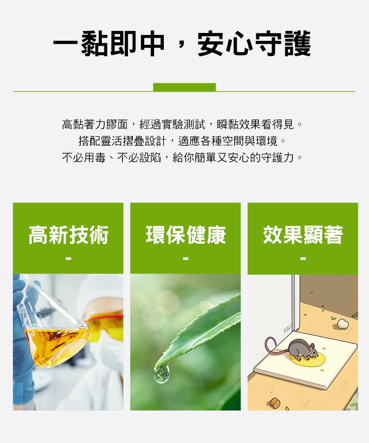 這款黏鼠板不僅高效能捕鼠,還具備環保特性,捕鼠後可以簡單處理,避免不必要的麻煩。