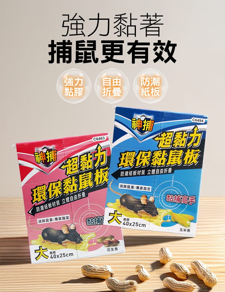 這款神捕超黏力黏鼠板,擁有雙重誘餌氣味——玉米香與花生香,能有效吸引鼠類,讓牠們無法抗拒!