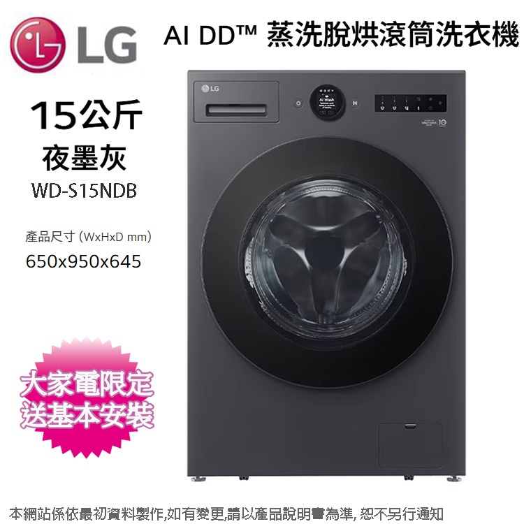 LG樂金15公斤AI DD™ 蒸洗脫烘變頻滾筒洗衣機 WD-S15NDB~含基本安裝+舊機回收