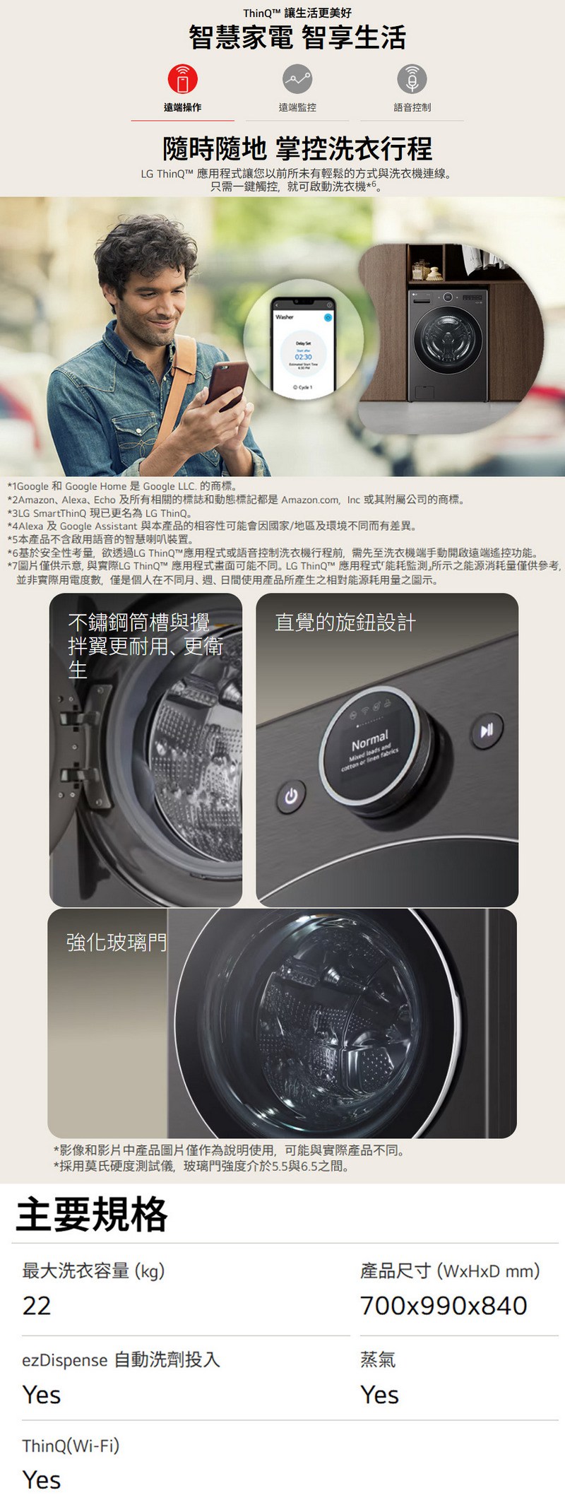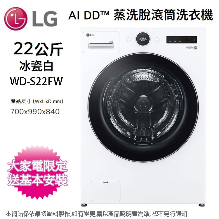LG樂金 22公斤AI DD™蒸洗脫變頻滾筒洗衣機 WD-S22FW~含基本安裝+舊機回收