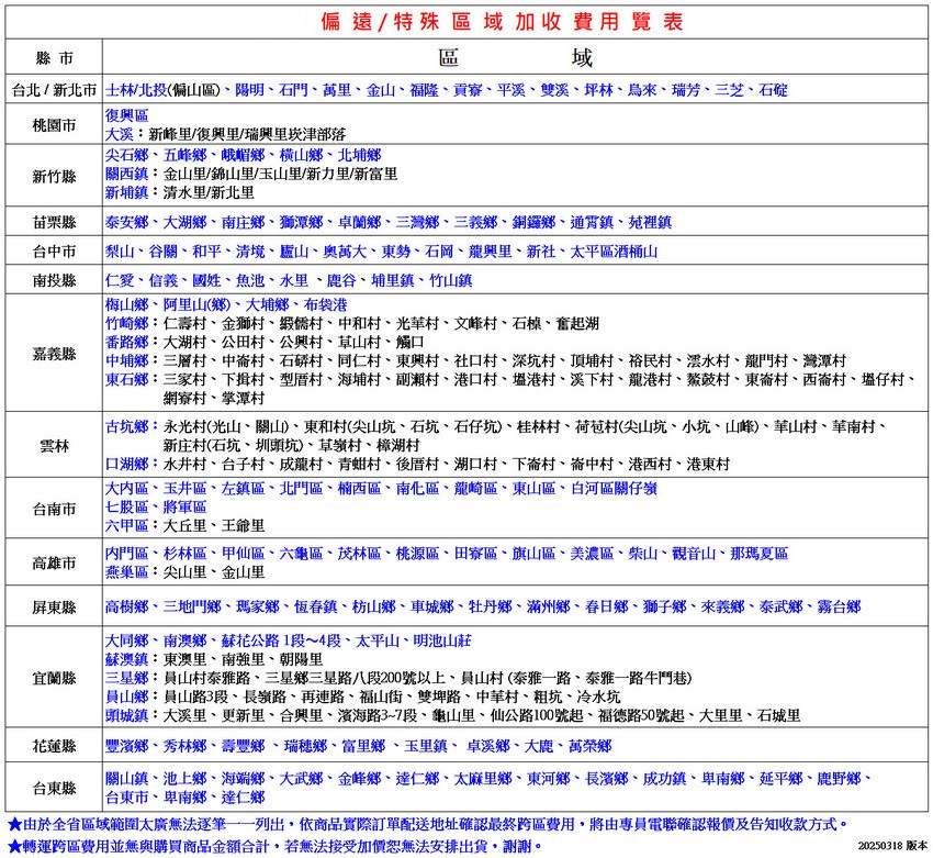 ◎本商品只限台灣本島運送,偏遠/特殊地區需額外加收物流處理費用(依圖示),由客服端另行通知訂單保留出貨與否的權利,請消費者見諒!!