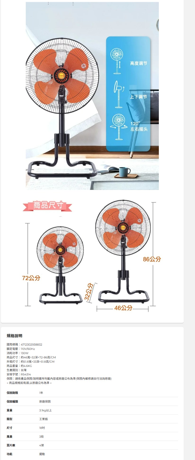 【金展輝】金展輝18吋擺頭工業立扇 A-1811