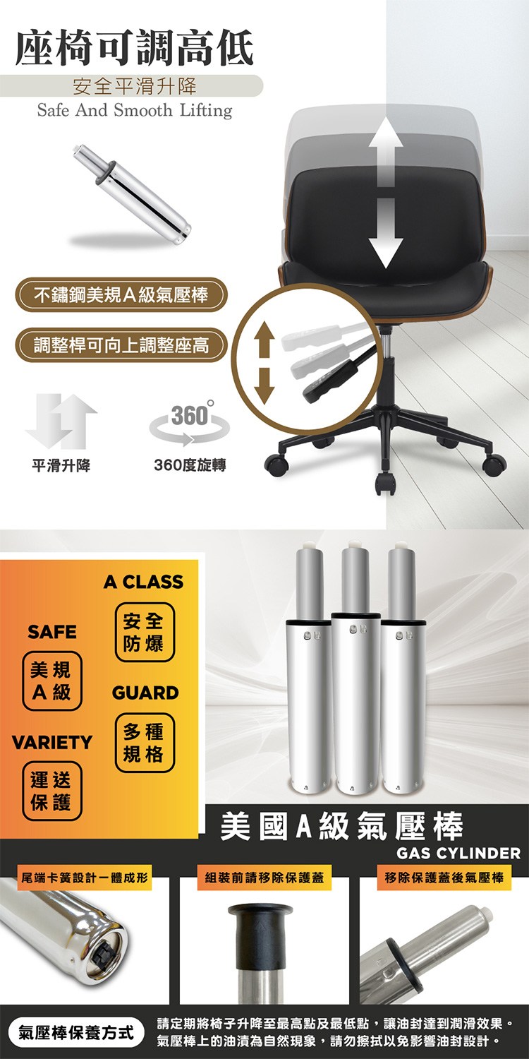 高密度泡棉椅背及椅座坐感舒適,配備美規A級氣壓棒、安全升降,黑漆金屬五爪腳、耐用且承重高,