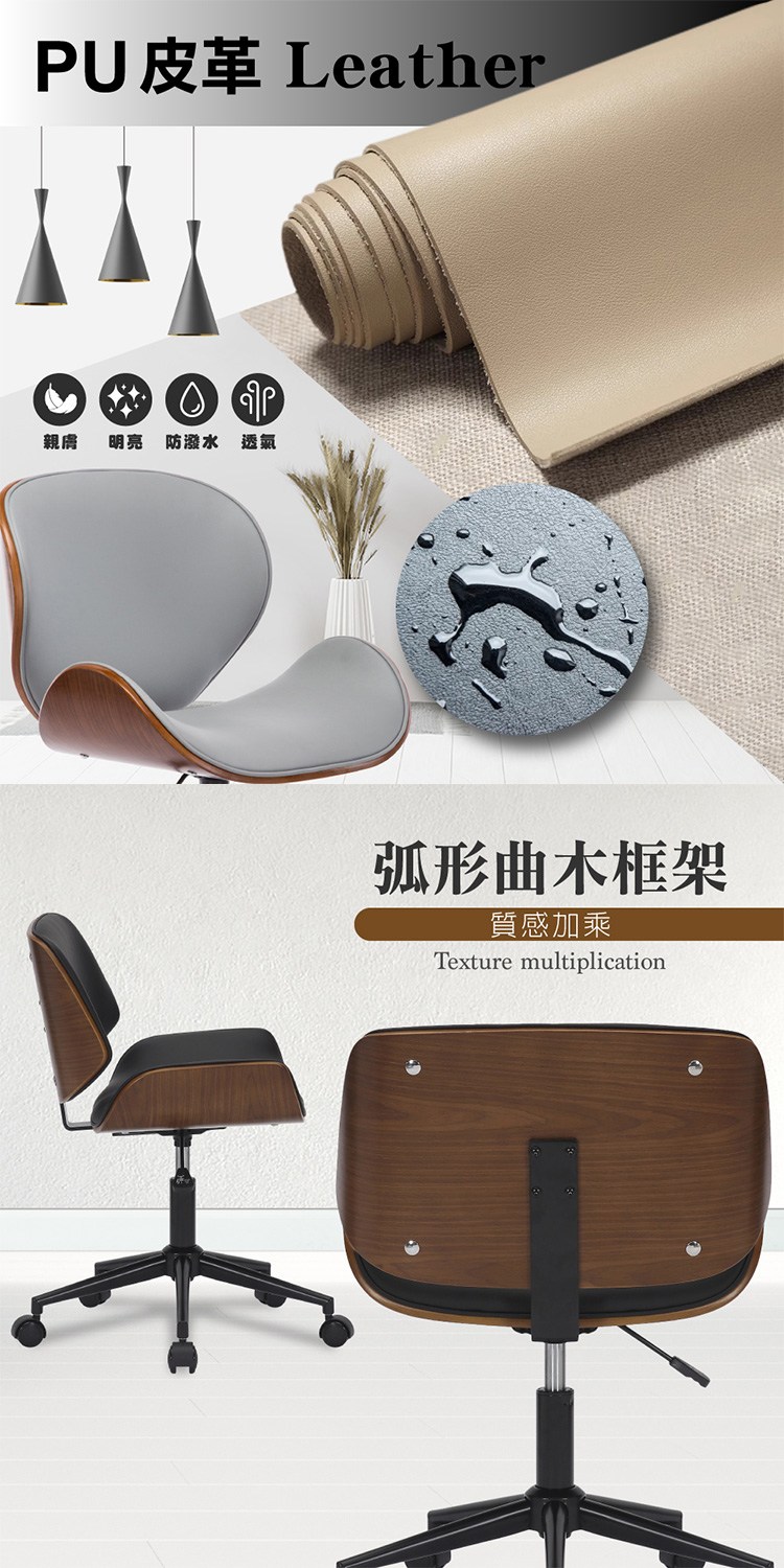 台灣與歐美同步販售、美規設計,防潑水PU皮座面,觸感佳易清潔,搭配獨特弧形曲木框架質感加乘,